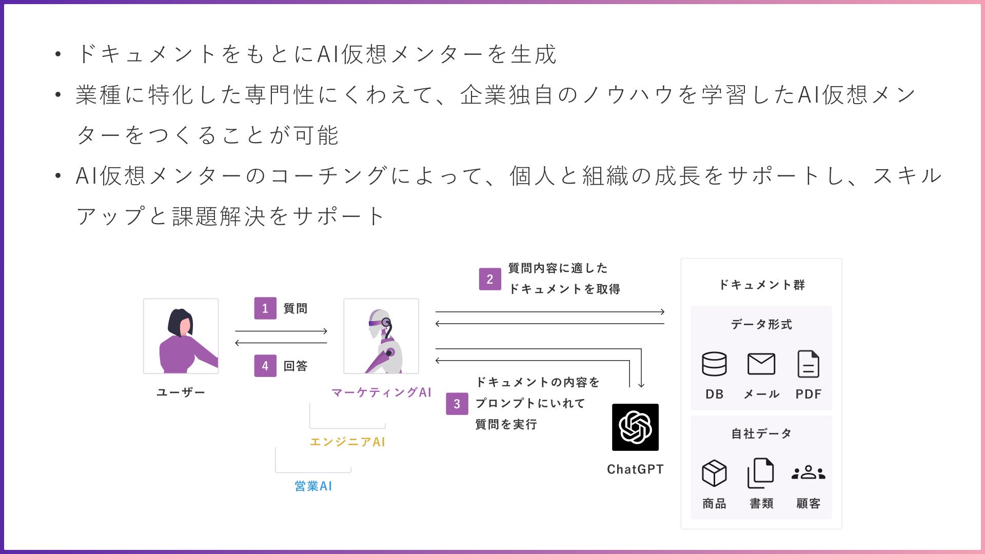 例えば、プログラミング学習をサポートする仮想メンター、組織の営業についてアドバイスを行う仮想メンター、マーケティング領域でアドバイスや企画書の生成などを行う仮想メンター…と活用事例は企業によって様々です。